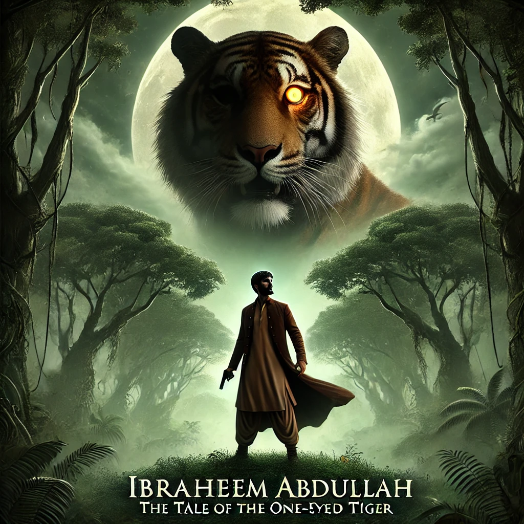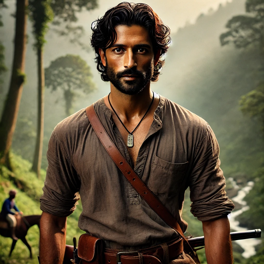 Ibraheem wears a simple, practical outfit suited for the jungle: a faded brown kurta, worn at the edges from days spent navigating the wilderness, tucked into rugged trousers. His boots are sturdy, scuffed from the long journeys through the forest, and a leather belt holds a sheathed knife, a tool he never goes without. His rifle, slung casually over his shoulder, has seen better days, but it is still a reliable companion.